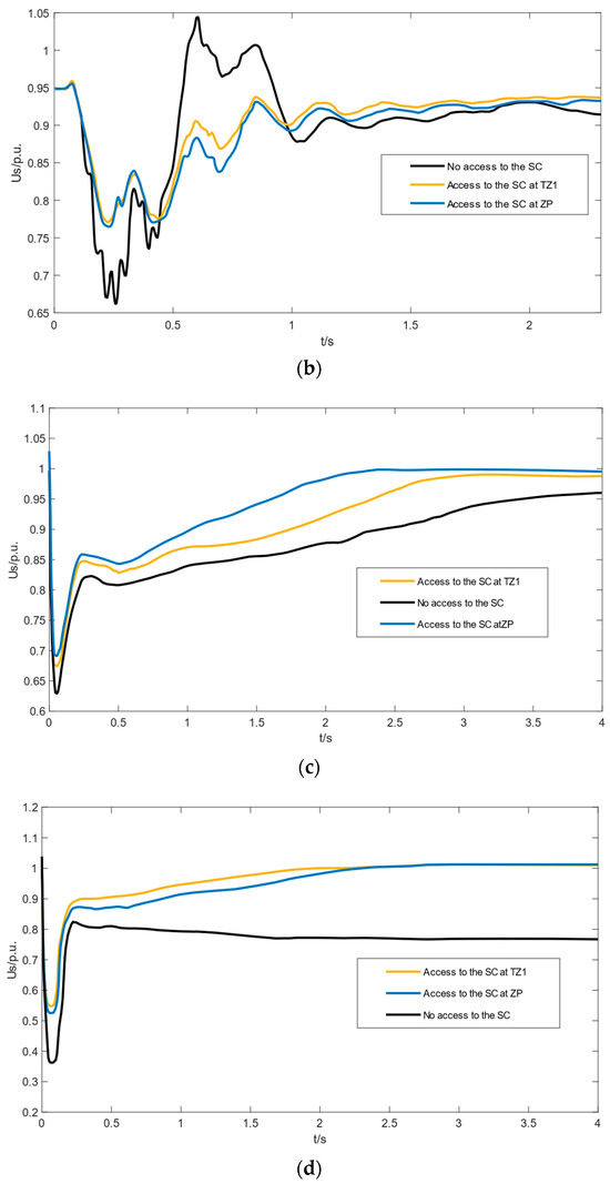 Scheme 2, with SZ access to 900 MVar, HA access to 300 MVar, and ZP access to 300 MVar, achieves the maximum system reactive power support capability of the SC at the lowest economic cost. Table 6 indicates that the SZ converter station has the highest demand for the SC. This is due to the poor transient voltage stability caused by the weak strength of the AC grid in the SZ area and the access to a large number of dynamic loads. Additionally, the close proximity between the SZ and ZP converter stations leads to a larger interaction factor, with SZ’s transient voltage fluctuations significantly impacting ZP. Therefore, the SC at the SZ converter station should be prioritized over ZP once the upper limit is reached. To verify the optimal configuration, Scheme 2, Scheme 3 with the same capacity but different access locations, and the scheme without access to the SC (Scheme 6) are compared and analyzed. The ZP–DW3 line at the 40% position (A) and the TZ1–DW3 line at the 5% position (B) are set to experience a three-phase short-circuit fault to compare the transient voltage waveforms of ZP and TZ1, as shown in Figure 9.