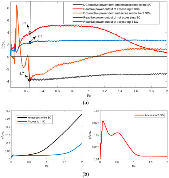 DC system reactive power output and demand, dynamic load slip variations. (a) Reactive power output and demand with different numbers of SC accessed. (b) Dynamic load slip variations with different numbers of SC accessed.