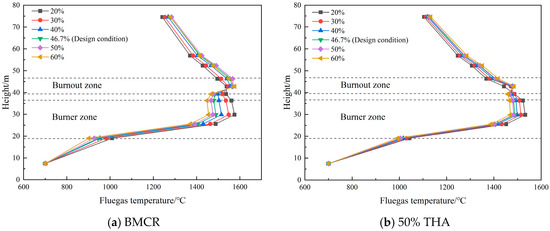 - The OFA ratio has a great influence on the temperature distribution in the furnace. The lower the OFA ratio, the higher the flue gas temperature in the burner zone and the lower the temperature at the furnace exit. Meanwhile, the lower the OFA ratio, the higher the fluid temperature and the shorter the length of the evaporation section. The temperature difference in the WCW outlet fluid at the 20% and 60% OFA ratios is 11.7 °C under the BMCR condition and 7.4 °C under the 50% THA condition.