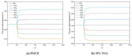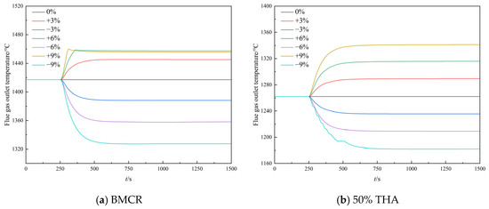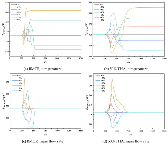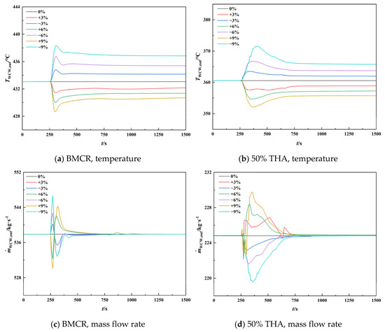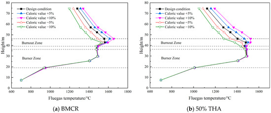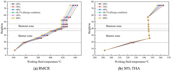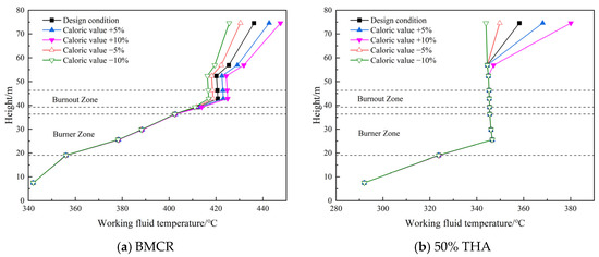 - The change in the coal calorific value has a limited influence on the temperature of the burner area, and the difference in the temperature is mainly reflected in the area above the combustion zone. Under the BMCR and 50% THA conditions, when the coal caloric value increases by 5%, the flue gas outlet temperature increases by 32.7 °C and 35.4 °C, and the fluid outlet temperature increases by 6.5 °C and 9.9 °C, respectively. Meanwhile, an increase in the coal calorific value results in a decrease in the dryout point height and a decrease in the length of the evaporation section.