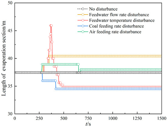 - The changes in the length of the evaporation section are −2.95 m, 2.95 m, −2.62 m, and 0.54 m when the coal feeding rate, feedwater flow rate, feedwater temperature, and air supply rate are suddenly increased by 5%, respectively.