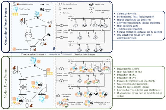 The rapid growth of renewable energy technologies has significantly reshaped the power and energy markets, leading to a transformation in power system architecture. DG has gained prominence, with large-scale renewable installations, such as solar parks and wind farms, now integrated into transmission and medium-voltage distribution networks [24]. This integration has transformed distribution systems into ADNs and SG [33], shifting from traditional, one-directional power flow to a more dynamic, bidirectional system. With the increasing integration of RES, the need for ESS to smooth power and voltage fluctuations becomes essential. Additionally, EVs will have a significant impact on modern power systems. Figure 2 highlights the key differences and features between conventional and modern power systems.