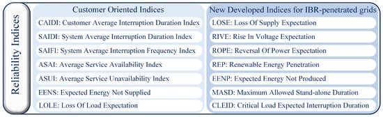 Reliability indices are used to quantify system reliability and can be divided into two categories: classic and modern indices. The classic indices, often referred to as customer-oriented indices, focus on traditional power systems aiming at characterizing the impact of system failures on the customers [88,89]. In contrast, modern indices have been developed specifically for modern power systems with high penetration of IBRs. Some of the reviewed reliability indices are presented in Figure 3. The most important indices include Expected Energy Not Supplied (EENS), System Average Interruption Duration Index (SAIDI), System Average Interruption Frequency Index (SAIFI), and Customer Average Interruption Duration Index (CAIDI) from the conventional indices, as well as Loss of Supply Expectation (LOSE) and Rise in Voltage Expectation (RIVE) from the newer indices. These indices can be obtained using Equations (1)–(6).