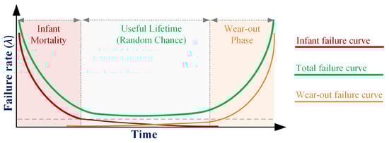 Figure 4 illustrates the failure rate behavior of a converter at various stages of its lifetime [19,106]. The first stage, infant mortality, represents failures during manufacturing and debugging, which are resolved prior to use. The second stage covers random failures during the converter’s lifespan, while the final stage, the wear-out phase, reflects component aging, applied stress, and the impact of mission profiles. Optimal converter design and operation require a thorough understanding of behavior during both the useful life and wear-out periods. Predicting wear-out failures is crucial for cost management and system longevity, as wear-out failures are more common than random failures over the useful life [106]. The mathematical approach for modeling a variable failure rate will be explained in the following.