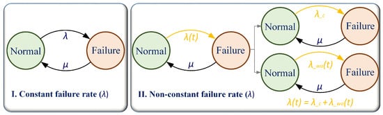 where and represent the failure and repair rates within the useful lifespan, respectively. The Forced Outage Rate (FOR), which defines unavailability, can also be calculated from Equation (7). The MP cannot be applied to systems with non-constant failure rates (Figure 4). As shown in Figure 5II, an additional time-varying term must be introduced in such cases for failure rate modeling. As previously mentioned, a converter’s capacitors and semiconductor devices are prone to both random failures due to abnormal operation and unexpected over-stressing, as well as wear-out failures from material degradation over time. Consequently, a system with a non-constant failure rate provides a more accurate representation of a converter’s real reliability model.