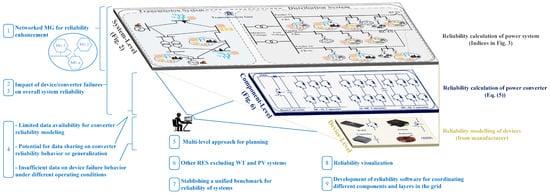 Studies on reliability assessment can generally be categorized into two layers: (1) system-level assessments and (2) component-level assessments. Both face distinct challenges, such as issues arising from Microgrid (MG) operations, the integration of RES and IBRs, and the complexities introduced by power electronic devices. System-level studies focus on assessing, enhancing, or modeling the overall reliability of power systems by evaluating various components, such as lines, transformers, buses, converters, and loads. These studies treat the components as part of a unified system, without delving into the specific reliability or aging processes of individual elements. This approach prioritizes the performance and robustness of the system as a whole. In contrast, component-level reliability assessments aim to evaluate, model, and improve the reliability of specific components, such as converters, by examining their failure modes, aging mechanisms, and operational stress factors. By focusing on individual components, these studies provide critical insights into how component-level performance can influence overall system reliability.