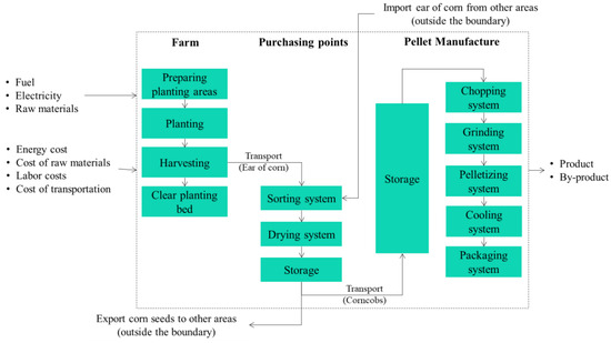 The same proportions of material consumption, energy usage in corn plantation and cultivation processes, and operating conditions observed in Nan province were applied to other provinces in the northern part of Thailand to achieve the total demand of 612,500 tons of ears of corn. The Thailand Alternative Power Development Plan 2015 [33] forecasted biomass demand for heat generation in 2036 to be 22,100 ktoe. Considering the biomass potential of the northern part of Thailand, the average growth rate from 2018 to 2021 was −1.34%. If the biomass production potential in this region continues to decline at this rate from 2021 to 2036, the accumulated biomass generation will be approximately 5286 ktoe. These figures indicate that the provinces located in the northern part of Thailand could be a significant supplier of biomass from agricultural residue for Thailand’s energy needs. Thus, the input and output quantities discussed in the following sections are related to the production of 55,125 tons of corn pellets.