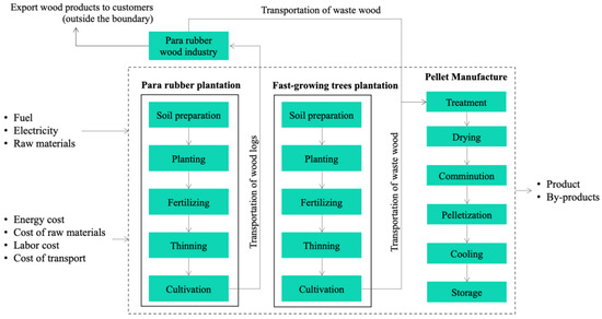 This research considered wood pellets from both fast-growing and Para rubber trees. Wood logs harvested from fast-growing trees are directly sent to pellet manufacturing facilities as raw material. Conversely, wood logs from Para rubber tree plantations are transported to the Para rubber wood industry for plywood production. Only wood waste generated by the process (e.g., wood chips and sawdust) is sent to the pellet manufacturer. This research did not consider the input and output items of the Para rubber wood industry, as they were outside the operational boundary. The flow process for the production of wood pellets is depicted in Figure 3.