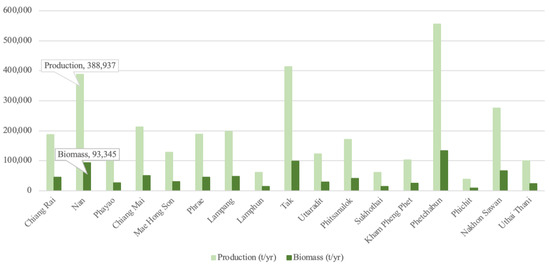 The annual production of the three pellet manufacturers is 55,125 tons. To achieve this production capacity, approximately 73,500 tons of corncobs are required annually. Consequently, the supply of corncobs necessitates approximately 612,500 tons of ears of corn. When considering the potential of Nan province to supply ears of corn to the manufacturers, according to the latest statistics published by the Office of Agricultural Economics, it was 388,937 tons in 2021. This implies that the biomass potential in the province is only 93,345 tons per year (using a residue-to-product ratio of 0.24 tons of residue per ton of corn to calculate the residual biomass from the total amount of corn). Therefore, 519,155 tons of ears of corn are needed from the nearest provinces to meet the production demand. Biomass potential in the northern part of Thailand in 2021 is depicted in Figure 4.