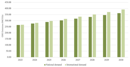 In Figure 5, GHG emission trends are presented for the period 2023 to 2030, segmented by national and international demand.