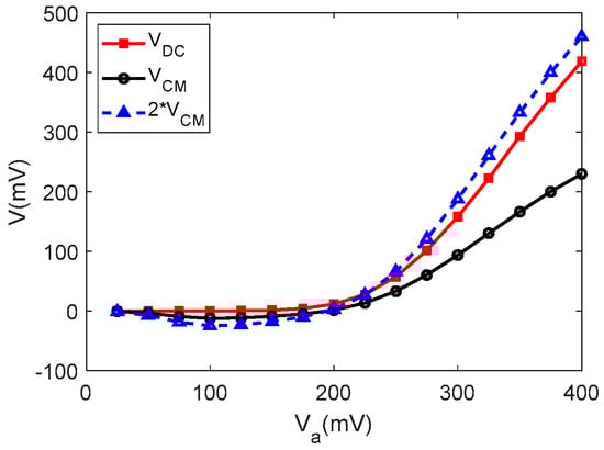 It is proposed in [28] that if the characteristics of NMOS and PMOS are ideally symmetrical, the DC voltages of VX and VY become just half of VDC in the steady state. But in fact, this statement does not always hold in the subthreshold region, which is beyond the scope of [28]. The DC voltages of VCM and VDC are shown in Figure 2. The measurement was carried out with Pin at −25 dBm; there is an evident difference between VDC and 2VCM.