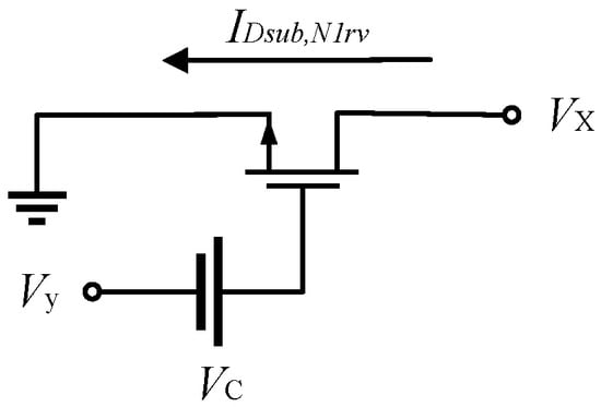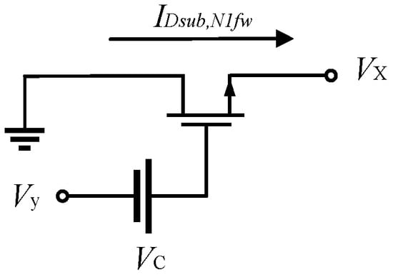We first analyze the MN1 path, at t = t3, Vin(t) = VDC, and VDS of the transistor is equal to zero. Hence, the transistor’s current is also equal to zero. After that, in the interval between t3 and t4, the input voltage is higher than the output voltage. We call the forward current in the subthreshold region IDsub,N1fw. The drain-source current of the transistor in the interval ([t3, t4]) is shown in Figure 5. The gate-source and drain-source voltages of the transistor in this interval are as follows: