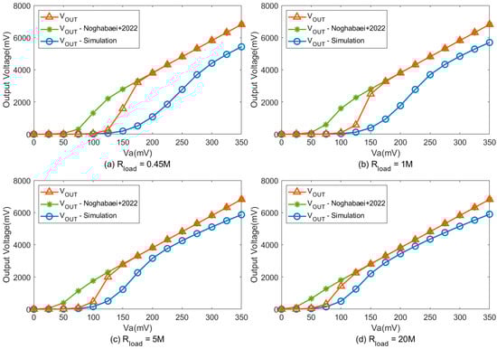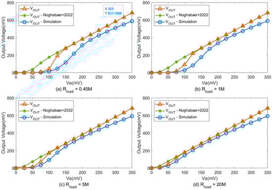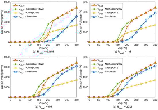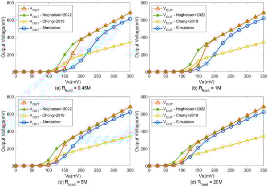 Output voltage of a single-stage rectifier vs. input voltage. WN = 960 nm; LN = 60 nm; WP = 960 nm; LP = 60 nm; VC,N = 100 mV; VC,P = −150 mV; (a) RLoad = 0.45 MΩ [16]; (b) RLoad = 1 MΩ [16]; (c) RLoad = 5 MΩ [16]; and (d) RLoad = 20 MΩ [16].