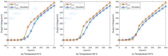 Figure 8 shows output voltages as a function of the input power with two compensation voltages from extra circuitries. VC,N is set to 100 mV and VC,P is set to −150 mV. It can also be seen that the model and [16] are in accordance with the simulation results, and our model has the smallest deviation from the simulation results, especially with heavy loads.