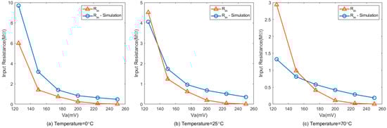 Figure 12 shows output voltages as a function of the input power of a single rectifier when T was set to 0 °C, 25 °C, and 70 °C, respectively, without compensation voltages. uN, uP, Vth,N, Voff,N, Vth,P, and Voff,P were set according to different temperatures. Temperature variations have a certain influence on the differences between the model and simulation results, but this influence was in an acceptable range. Figure 13 shows input resistances as a function of the input power of a single rectifier when T was set to 0 °C, 25 °C, and 70 °C, respectively, without compensation voltages. Temperature variations have a certain influence on the differences between the model and simulation results, but this influence was in an acceptable range. When the process is set to TT, the effects are minimal.