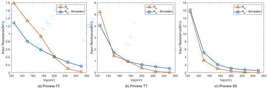 Input resistance of a single-stage rectifier vs input voltage. WN = 960 nm; LN = 60 nm; WP = 960 nm; LP = 60 nm; VC,N = 0; VC,P = 0; RLoad = 5 MΩ; temperature = 25 °C; (a) process is FF; (b) process is TT; (c) process is SS.