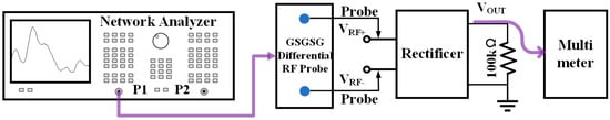 The CCDD rectifier was fabricated in the 65 nm standard CMOS technology by the authors of [15] and the measurement results were reported in [15]. Rectifier transistors are low-threshold transistors, and the rectifier was optimized separately for its optimum performance. In this experiment, WN is set to 1480 nm, LN is set to 180 nm, WP is set to 4000 nm, LP is set to 100 nm, frequency is set to 433 MHz, and the load RL is set to 0.1 MΩ, according to [15]. The measurement setup consists of a vector network analyzer and a digital multimeter. A GSGSG differential prober with a reference plane set to the on-chip pads of the rectifier’s input is used to probe and sweep the chip. When the output RF power of the vector network analyzer is swept, the corresponding S-parameters and output voltage at the load are recorded. The instantaneous input power delivered to the rectifier is calculated by subtracting the transmission and the reflection losses from the RF power. The measurement setup is popular and commonly utilized in related articles, and a block diagram of the measurement setup is given in Figure 16. So, these measurement results are adopted to verify the model. Meanwhile, we use the proposed model and the model of [16] to predict the output voltages and input resistance.