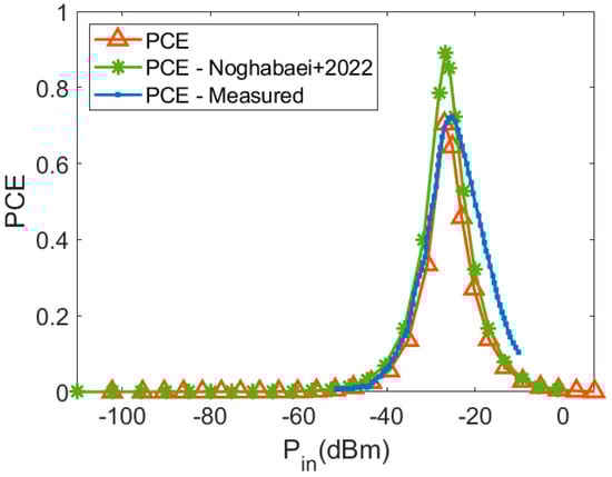 Due to the lack of input resistance data in [15] and input resistance being reflected from PCE according to the derivation process, the PCE results of [15] are adopted to verify the model. Figure 18 shows the measured PCE of [15], and the PCE predicted by our model and the model of [16] versus the input powers. The measured results, predicted results of the model, and predicted results of [16] are consistent where the input powers are below −25 dBm. Furthermore, the proposed model matches the measured results better than the model of [16].