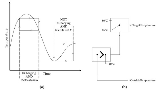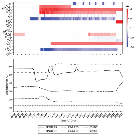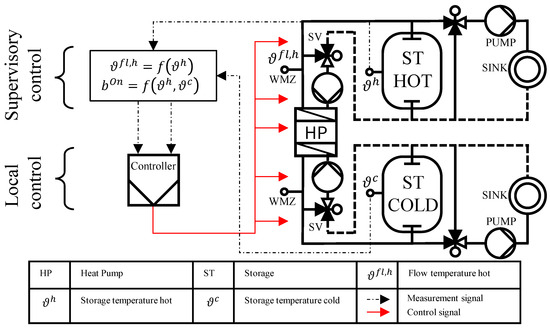 Schematic illustration of the control strategy for the use case presented in Section 5.1, here for the HNHT and the linkage system between HNHT and HNLT. In addition to the design pattern elements presented in Section 4, the achieved temperature hystereses are also depicted.