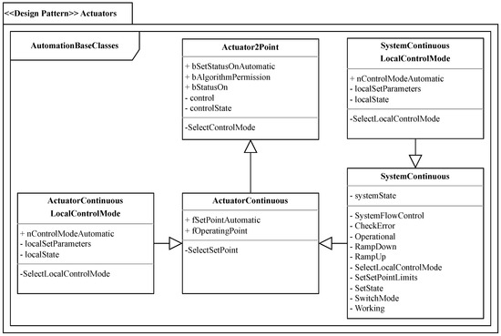 The design pattern actuators derives from the AutomationBaseClasses, as we outlined in [16,20]. This pattern falls under the behavioral category, focusing on interactions among objects, see Section 3. Hence, its application is specifically related to objects. Technical components that manipulate process inputs are commonly called actuators. They normally need electrical, hydraulic, or pneumatic support energy [45] (p. 441). Following our work in [16] (p. 218), actuators can either adjust processes discretely (2 point) or continually. The design pattern actuators can be applied to all discrete and continuous actuators. In Figure 2, it is shown that a state-of-the-art heating and cooling system has several actuators. These actuators have to be the implemented to be accessed by the automation program. The abstract heating and cooling system already includes four pumps and four control valves. While different specifications may apply to each actuator, ultimately, every pump and control valve must be implemented similarly. In Figure 4, the structure of the design pattern is depicted in a UML package diagram. It consists of the classes ActuatorContinuous, which is derived from the Actuator2Point class, the ActuatorContinuous LocalControlMode class, and the SystemContinuous class, both derived from the ActuatorContinuous class, and the SystemContinuous LocalControlMode class, which is derived from the SystemContinuous class.