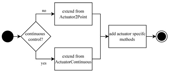 Following the description according to the pattern schema, the implementation follows the approach presented in Figure 5. First, whether a continuous or a discrete actuator needs to be implemented must be clarified. Next, the classes can be extended accordingly. Finally, specific methods, relevant to the actuator, can be implemented.