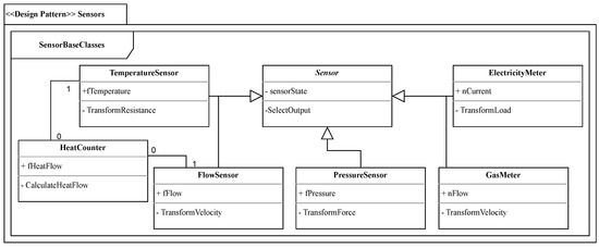 Sensors are the first element in the measurement chain and, therefore, the linking element between a process and its signal processing unit [45] (p. 413). In the context of this work, only sensors that transfer the physical measurement procedure into electrical signals are relevant. The design pattern sensors is a behavioral pattern with a scope on objects Section 3. It is a further development of the AutomationBaseClasses from [47]. To control processes, information about the current state of the process is required. Processes that are in need of a control input typically have different physical characteristics that need to be monitored. Therefore, different measurement principles have to be applied. In the context of industrial heating and cooling systems, mechanical, thermal and electrical measurands are relevant. In Figure 6, the different sensor types (electricity meter, gas meter, pressure sensor, flow sensor, heat counter, temperature sensor) are presented within a UML package diagram, presenting the structure of the design pattern sensors.