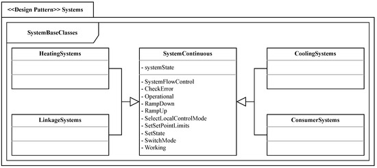 As presented in the package diagram for the overall framework in Figure 3, the design pattern systems is directly related to the actuator and sensors design patterns and enables the transition from components to thermal networks. It comprises different specific component definitions and extends from the base class SystemContinuous, which originates from the AutomationBaseClasses from [20] (p. 3). Following the interface and structure definition, the design pattern can be characterized between structural (actuator interface to thermal network) and behavioral (method definition for system components). In Figure 8, the design pattern is represented as a UML package diagram.