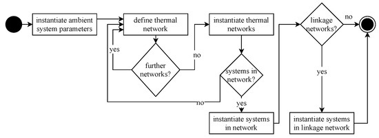 In [40] (pp. 23–24), the programming paradigm of object orientation is described as an effective method to model complex, technical systems. Therefore, we use it as the methodological basis for developing our framework. It builds the counterpart to procedural programming and is characterized by class definition and instantiation [41] (pp. 381–433). When classes are instantiated, they are called objects. Classes are constituted of methods and attributes. Attributes are local variables of classes and only accessible via class specific functions, called methods. Attributes are generally only accessible via methods. This restriction is called data encapsulation. To avoid code redundancy, the concepts of inheritance and polymorphism are applied. Inheritance allows the definition of a class and object hierarchy, where methods are inherited by lower hierarchical classes (specialization) or methods are generalized in top classes (generalization). Polymorphism enables methods to be implemented differently for different objects. The elaborations on object orientation are based on Silberbauer et al. [42] (pp. 41–64). As we aim with our work at higher abstraction levels, we further apply the concepts of frameworks and design patterns. Following [22] (pp. 26–28), frameworks typically contain several design patterns and are representable in code. The integrated design patterns are smaller architectural elements, less specialized than frameworks. Gamma et al. describe a catalog of design patterns. These are categorized in terms of purpose and scope as follows: