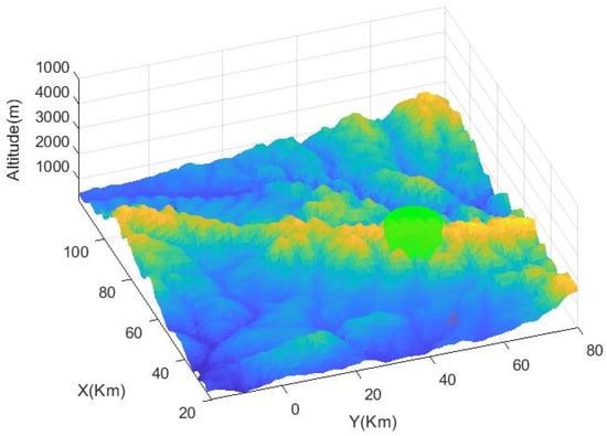 Here, and represent the coordinates of the point on the x and axes, respectively, and , , , , and are constant coefficients. By controlling the magnitude of these constant coefficients, different undulating terrains can be generated in simulation software (Matlab 2019b), as shown in Figure 4. Furthermore, in order to enhance the 3D path planning examples to better navigate through more complex scenarios that include various terrains and obstacles, and to demonstrate the algorithm’s capabilities under diverse conditions, we have incorporated adverse weather factors into the 3D terrain modeling. As shown in Figure 4, the green circular areas in the diagram represent these negative weather conditions. By doing so, we can more comprehensively showcase the algorithm’s performance and adaptability under a variety of environmental conditions. This not only enhances the practicality of path planning but also improves the safety and efficiency of UAVs in real-world applications.