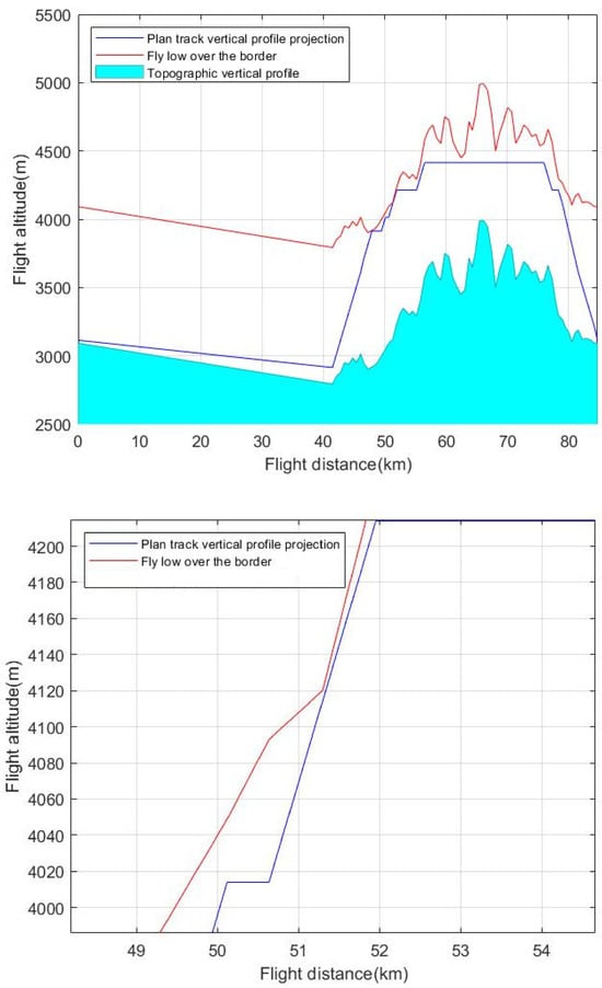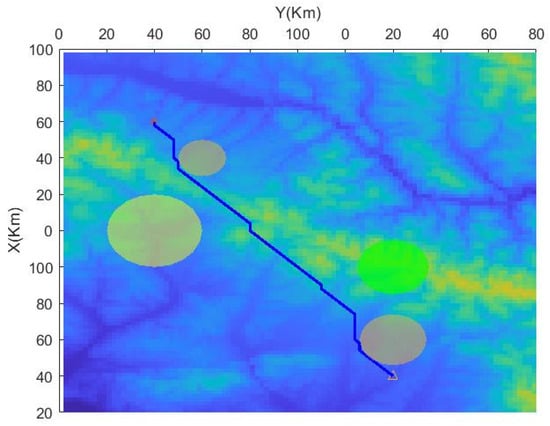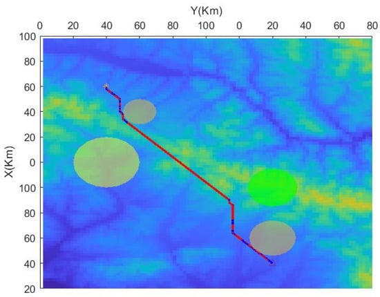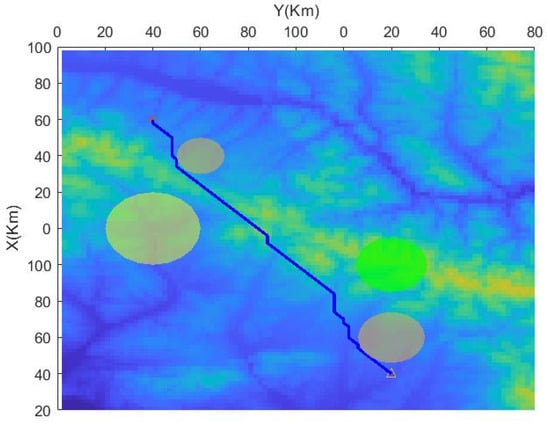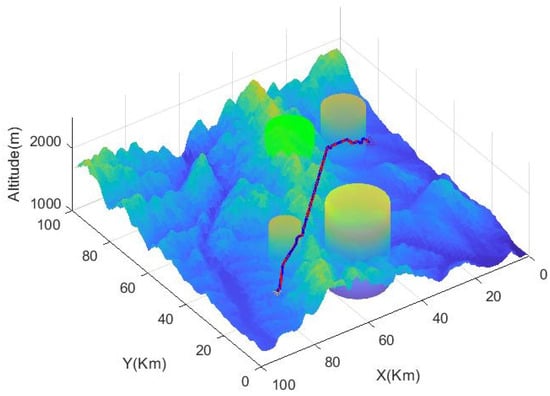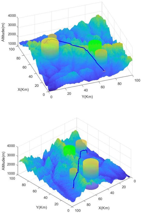 Then, based on the improved A-STAR algorithm, the simulation is performed again. According to the set constraints, the parameters are set as: , , , and . To take into account the maximum and minimum flight altitudes, , , and .
