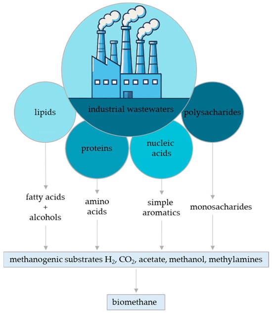 The amount of industrial wastewater and organic waste is an ever-growing problem [3]. Since the end of the 19th century, systems for anaerobic wastewater treatment have been in use. Recently, extensive research has been conducted to gather a deeper understanding of anaerobic processes employed in wastewater treatment. Methanogenic pathways are the primary pathways for most organic matter disposal [28]. Methanogens reduce wastewater oxygen demand and, as a result, produce renewable biogas in the form of biomethane [10]. However, this remediation method can be utilized only when a high level of readily biodegradable soluble organic matter is present. Anaerobic remediation techniques are usually used for high-loaded wastewaters with COD (chemical oxygen demand) greater than 1.5–2 g L−1. Besides substantial results in the treatment of heavily polluted wastewaters with a COD between 3 and 4 g L−1, anaerobic treatment has some success in the remediation of wastewaters with a COD lower than 1.5 g L−1 [28]. In wastewater, organic matter is decomposed by a variety of microorganisms. Primary producers decompose raw waste into organic fatty acids or other substrates, which are then consumed by methanogens to produce biomethane. A simplified representation of these reactions is shown in Figure 1. The composition of syntrophic microorganisms utilized in wastewater remediation is guided by wastewater type, pH, temperature, reactor design, and organic loading rates [3,28]. In anaerobic reactors, methanogens take up 5 to 6% of the total microbial population, while the rest is occupied by the bacterial population [28].