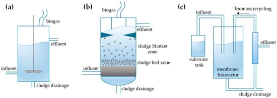 Schematic representations of reactors: (a) continuously stirred tank reactor; (b) upflow anaerobic sludge bed reactor; (c) membrane bioreactor. Modified by authors from Refs. [3,28].