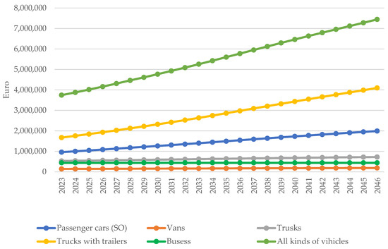 The analysis of the data clearly shows that for each vehicle category there has been an increase in the cost of toxic emissions over the projected 25-year period. The largest increases were for trucks with trailers and passenger cars. In total, for all vehicle categories, emissions costs nearly doubled from 2023 to 2046, from €3,745,229 to €7,443,384. Figure 3 identifies the vehicle groups that could be prioritised for constraints, thus indicating which of the vehicle groups analysed is in need of transformation in the form of replacing current propulsion systems with low-emission ones.