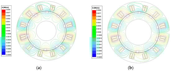Motor magnetic flux line distribution: (a) The rotor inner diameter is 40 mm; (b) The rotor inner diameter is 50 mm; (c) The rotor inner diameter is 60 mm; (d) The rotor inner diameter is 70 mm.