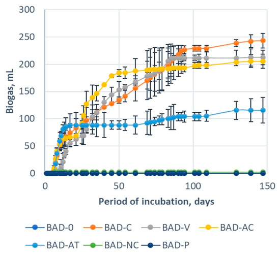 Monitoring biogas production during BAD revealed considerable differences among the samples. Specifically, BAD-C produced the highest biogas volume (252.5 mL), which was followed by BAD-V (212.5 mL) and BAD-CA (205.6 mL). In turn, BAD-AT presented relatively low biogas production (115.5 mL). The lag phase in BAD-C, BAD-CA, and BAD-AT lasted for 5, 6, 7, and 10 days, respectively. The overall biogas production period was polymer specific and varied from 14 days (BAD-AT) to 140 days (BAD-C). BAD-0, BAD-NC, and BAD-P did not produce biogas under the tested conditions (Figure 1).