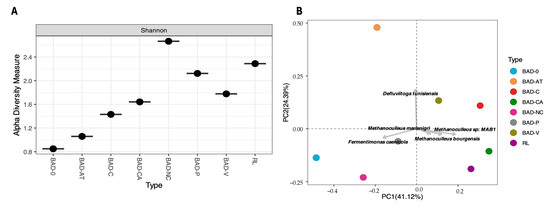 Diversity analysis of the landfill leachate samples. (A) The Shannon index values for the various landfill leachate samples. (B) Principal component analysis based on the Hellinger-transformed abundance data. RL—raw leachate; BAD-0—without polymers; BAD-C—with cellulose; BAD-V—with viscose; BAD-CA—with cellulose acetate; BAD-AT—with acetate textile; BAD-NC—with nanocellulose; BAD-P—with pectin.
