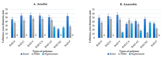 The cellulolytic activity was tested in the intact samples as well as its liquid and solid phases, which were obtained by centrifugation. Enzyme activity in the supernatant is expected to reveal an abundance of extracellular enzymes. As shown in Figure 4, the cellulolytic activity in the intact landfill leachate samples and their pellets and supernatants differed depending on the type of polymer added. Furthermore, aerobic versus anaerobic conditions during the enzymatic reaction influenced the final clear zone diameter. Specifically, the intact samples under aerobic conditions exhibited similar cellulolytic activity (i.e., the diameter of the clear zone was 46–56 mm) except for BAD-NC, which demonstrated the lowest activity with a zone diameter of 22 mm. BAD-NC demonstrated contrasting behaviour in cellulolytic activity in the pellet and supernatant compared with the other samples. In particular, only BAD-NC did not show cellulolytic activity in the pellet fraction. Only two samples—BAD-NC and BAD-AT—demonstrated activity in the supernatant (Figure 4A). In turn, under anaerobic conditions, more samples exhibited cellulolytic activity in the supernatant with the highest values in BAD-NC and BAD-CA (38 and 36 mm, respectively). The BAD-C, BAD-P, and BAD-0 supernatants did not show any cellulolytic activity (Figure 4B).
