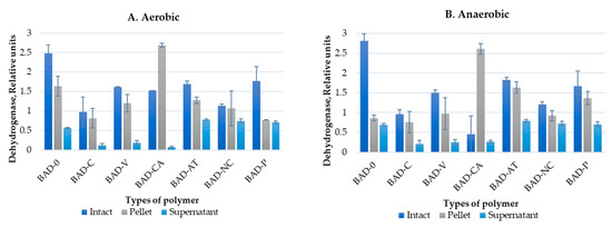 DHA also broadly varied depending on the polymer that was added. Under both aerobic and anaerobic conditions, the BAD-CA pellet had the highest DHA (Figure 5). The BAD-C, BAD-V, and BAD-CA supernatants exhibited the lowest DHA among the samples (Figure 5).