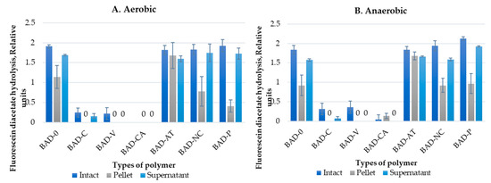 The data on the FDA hydrolysis activity of after BAD are summarised in Figure 6. Overall, there was higher activity in the supernatant compared with the pellet except for BAD-AT, where both polymer-associated and extracellular activity showed similar results. There was unexpectedly low hydrolytic activity in BAD-C, BAD-V, and BAD-CA (Figure 6).