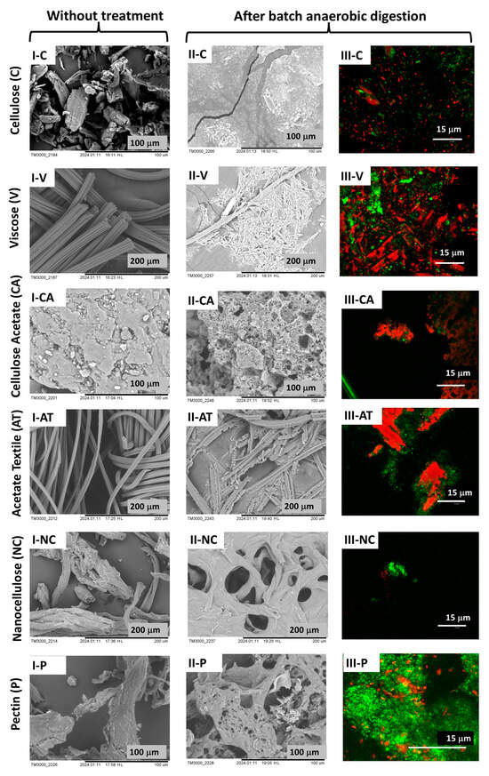Batch anaerobic digestion (BAD) used the following: CA with an average Mn of ~30,000 (GPC); Sigmacell Cellulose Type 20, 20 μm, and pectin from apple (Sigma-Aldrich, St. Louis, MO, USA); nanocrystalline cellulose CNC (diameter 10–20 nm, length 300–900 nm) from Nanografi Nano Technology (Ankara, Türkiye, NG01NC0101; and C and AT from Abakhan Fabrics Eesti Latvijas Filiāle (Riga, Latvia).