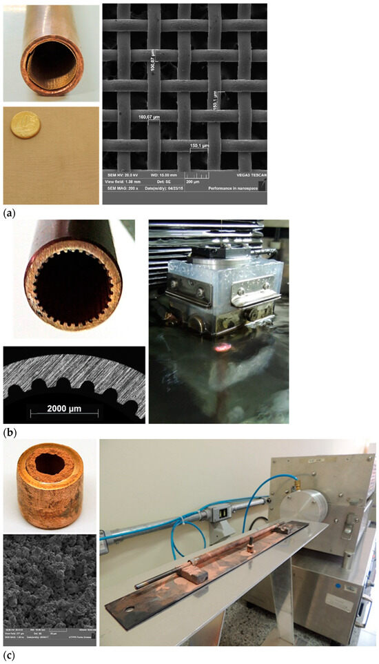 Krambeck et al. [53] used sintered copper powder capillary structures in heat pipes. The sintered capillary structure used in the study was manufactured from copper powder obtained through gas atomization. The material was then sintered, producing structures with three different internal diameters. For this work, data were obtained for the structure with an internal diameter of 2.125 mm (Figure 2c).