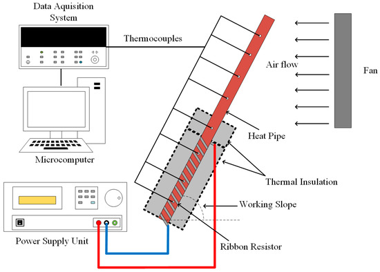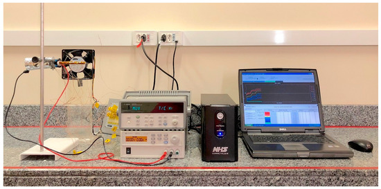 Figure 4 presents a schematic diagram of the experimental apparatus, which consists of a heat pipe equipped with thermocouples in its various operating regions, thermal insulation, a ribbon resistor connected to a power supply unit to heat the evaporator region, a fan for air cooling in the condenser region, a data acquisition system, and a microcomputer.