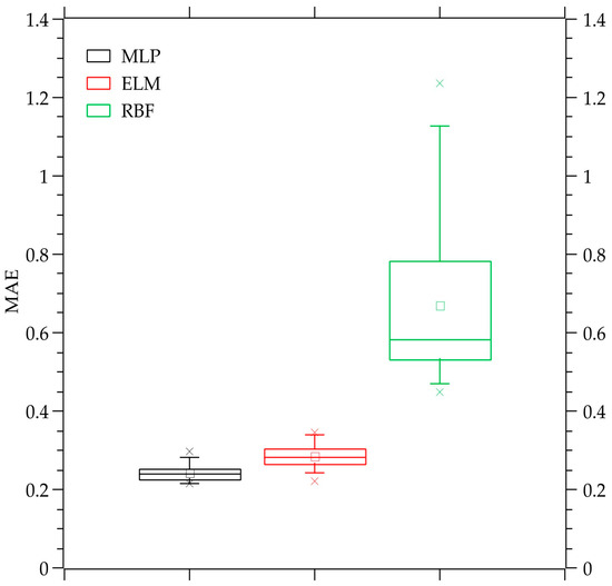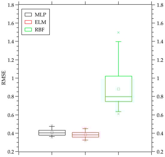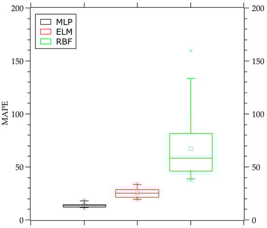 The results show that the MLP and ELM networks can better generalize the problem, generating consistent errors between tests and within the expected levels. The MLP network presents better results concerning MAPE and MAE errors for this problem. The MAPE found for the MLP network is around 45% lower than that presented by the ELM network. At the same time, the MAE is around 15% smaller. The lowest RMSE was found for the ELM network, with a result that was approximately 6% lower than the result for the MLP network. The RBF network demonstrated more significant errors during the tests, with results of much lower quality than those shown by other neural networks. It is important to highlight that the RMSE is the error metric that has been reduced during the neural models training [64,65,66,67]. Figure 6, Figure 7 and Figure 8 are the boxplots of MAPE, RMSE, and MAE, respectively, which include calculations for the 30 simulations performed for each neural network used.