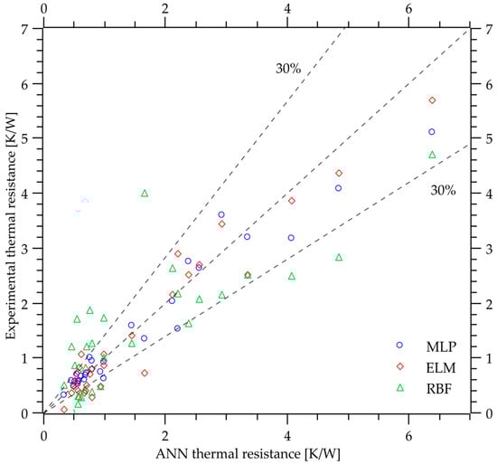 Figure 9 compares the thermal resistances of the heat pipes obtained experimentally and those obtained using ANNs. The thermal resistance represents the system resistance to heat flow and can be used to evaluate the heat pipe. The results obtained in the works of [51,52,53] were compared to those obtained by applying the heat pipe’s characteristics as inputs to the ANN.