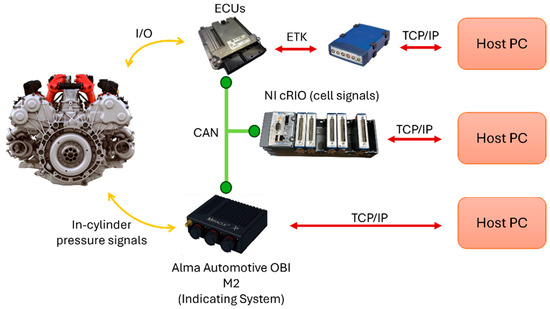 As seen in Figure 1, an engine control unit (ECU) for each bank controls the engine, equipped with ETAS hardware and software tools to manage different working conditions and impose the actuations required by each specific test. Furthermore, real-time communication between the ETAS tools and the test bench acquisition system allows the collection of iso-frequency and phased data between the actuations and the data sensed by the engine test bench.