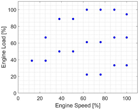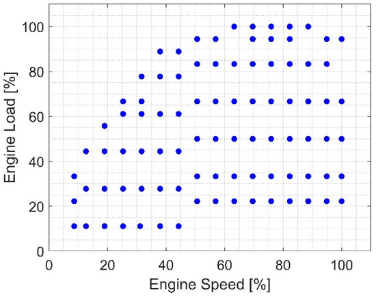 The neural network must be capable of modeling the value of the MFB50 at different engine working points, with standard calibrations of the main actuations and reference inlet air conditions. Thus, it must be sensitive to the variations in the combustion phasing with different engine speeds and loads. For this purpose, a wide grid of engine operating points is collected to avoid the risk of extrapolation during the model’s inference. This goal is fulfilled by testing the engine up to its physical minimum and maximum values for both the engine speed and load, avoiding the possibility of simulating maneuvers or operating conditions outside of these boundaries. As visible in Figure 2, which shows the steady-state data recorded for the ANN training, the operating points of the grid are quite narrow to ensure good interpolation capabilities, avoiding being too well fitted, which could lead to a risk of overfitting (a total amount of 89 engine points are collected). The engine speed and load are normalized with respect to the maximum value and then converted to percentages. This normalization process for the engine speed and load is followed throughout this paper.