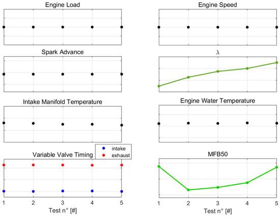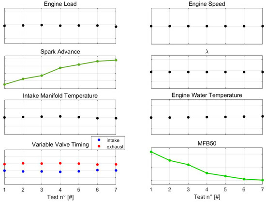 An important characteristic of these tests is that, during the variation in each input, all other independent variables are kept as constant as possible, as visible in Figure 4 and Figure 5. If it is an actuated variable, it is fixed at the same value as for standard calibration; meanwhile, if it is a sensed parameter, it must be close to the reference value. This element is very important to isolate each input’s effect on the combustion phasing. The numerical values of the variables are omitted for confidentiality; thus, it is important to highlight that the maximum value of oscillation accepted is ±5%, especially for those parameters that are difficult to control (e.g., the intake manifold temperature).