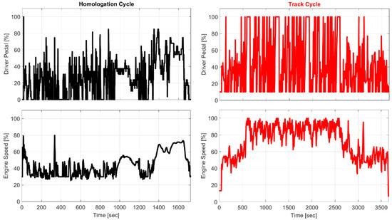 Figure 6 shows an example of a standard homologation cycle on the left and a track test profile on the right side, represented both by the normalized driver pedal position and normalized engine speed. It is also important to highlight that, throughout the whole validation process, transient tests with both standard calibration and different control strategies are performed. This is crucial to fully explore the capability of the developed model to reproduce combustion metrics in transient conditions and non-conventional control srategies.