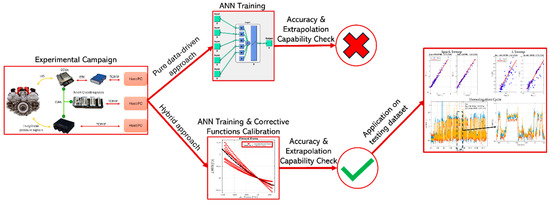 The two approaches compared in this work are as follows: the first relies solely on pure ANN models, while the second, referred to as the hybrid approach, combines ANNs with analytical corrective functions to account for the effects of various variables and actuations. The accuracy of both approaches is compared by evaluating the error under steady-state conditions, and the hybrid one is demonstrated to be the most accurate, especially due to its stronger extrapolation capabilities. The complete research workflow is reported in Figure 7.