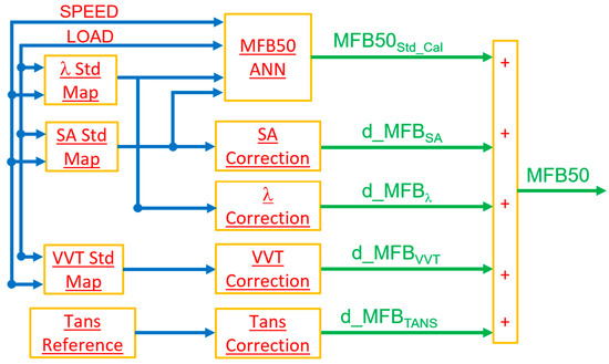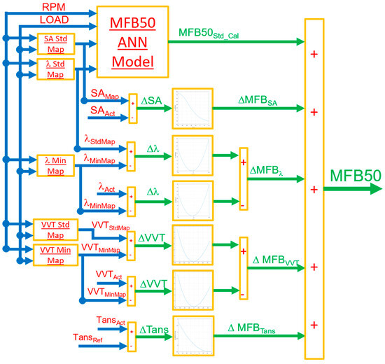 For the analytical corrective functions, various sweep tests, as mentioned in the previous sections, are carried out. An individual corrective function for each of these actuations is developed (as explained in the model development section, i.e., Section 4), which captures the effect of the variation in the given actuation. At the end, all of the corrective functions, along with the output of the ANN, are summed to give the final calculated MFB50. Figure 8 shows the general block scheme of this calculation chain.